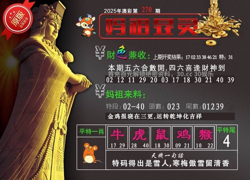270期:绝杀三肖✦【虎鸡猴】✦开:羊35中 |